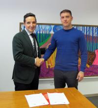 Juan Manuel Corchado y Antonio José Alonso Gómez tras la firma del convenio de colaboración suscrito.