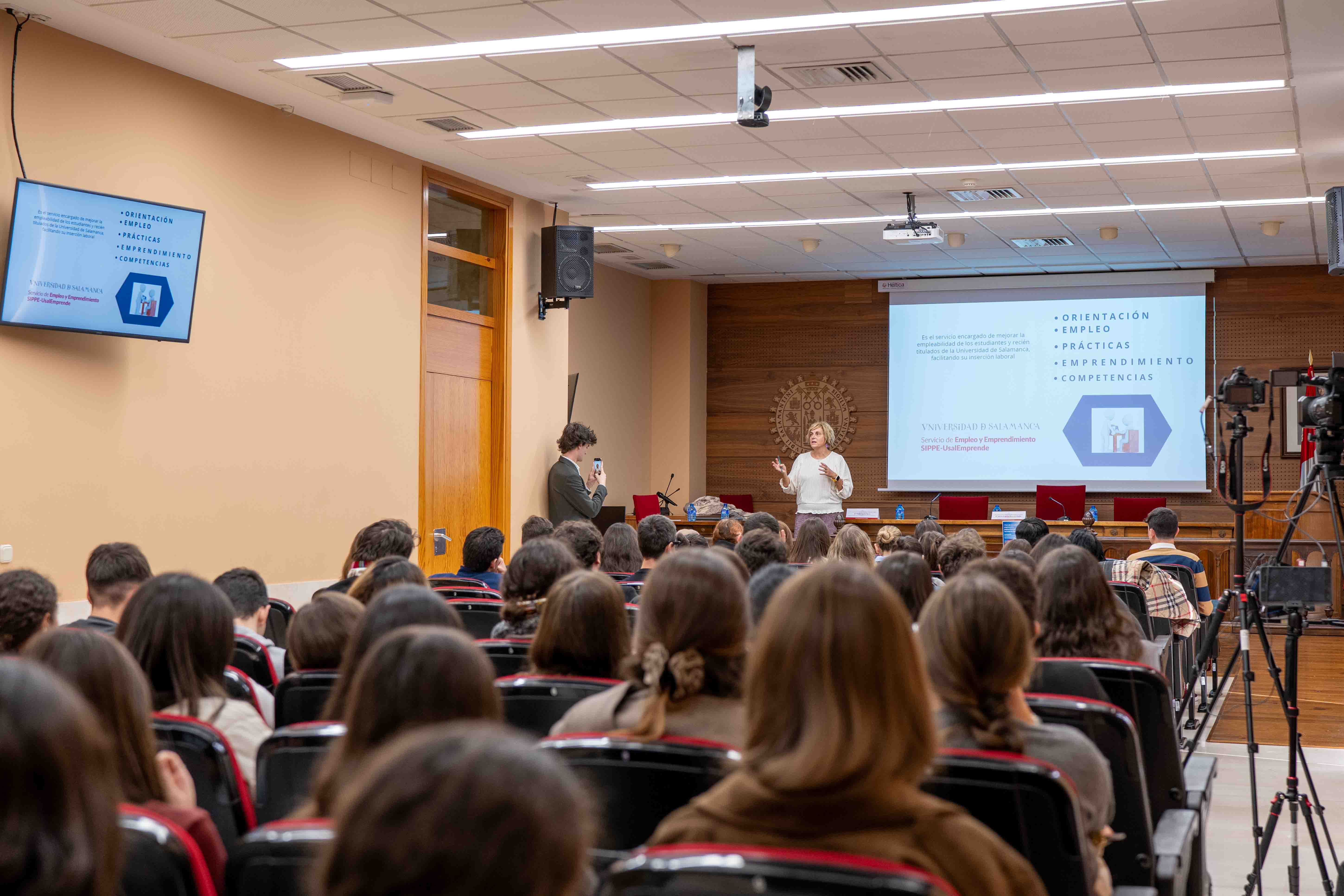 La primera intervención estuvo protagonizada por Mabel Santa Daría, asesora de Emprendimiento del SIPPE, que expuso a los asistentes el funcionamiento del ecosistema emprendedor de la USAL, así como el Pasaporte de Empleo, un documento que certifica la participación en actividades orientadas a mejorar la empleabilidad. Además, recordó que la Universidad trabaja para consolidarse como institución emprendedora y presentó programas como USAL Emprende y Explorer, además de los itinerarios personalizados de asesoramiento.